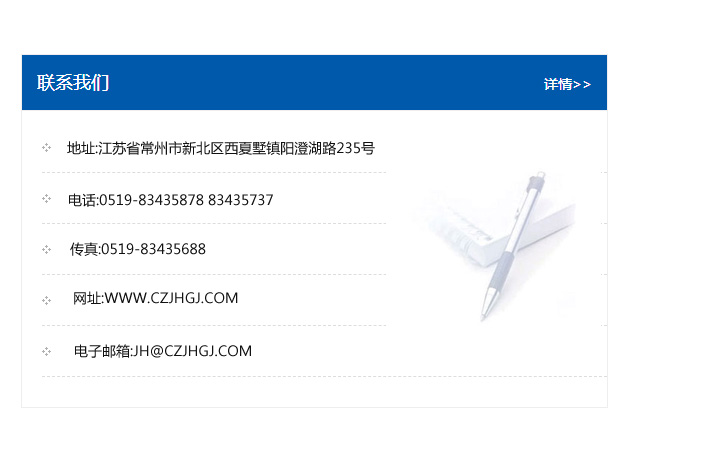 地址:常州市新北區友邦商務大廈1幢16、17層  電話:0519-85101652  傳真:0519-85112595  郵編:213022  網址:www_cz-jiayue_cn.dhhlxs.com  郵箱:xiajifengaa@163.com